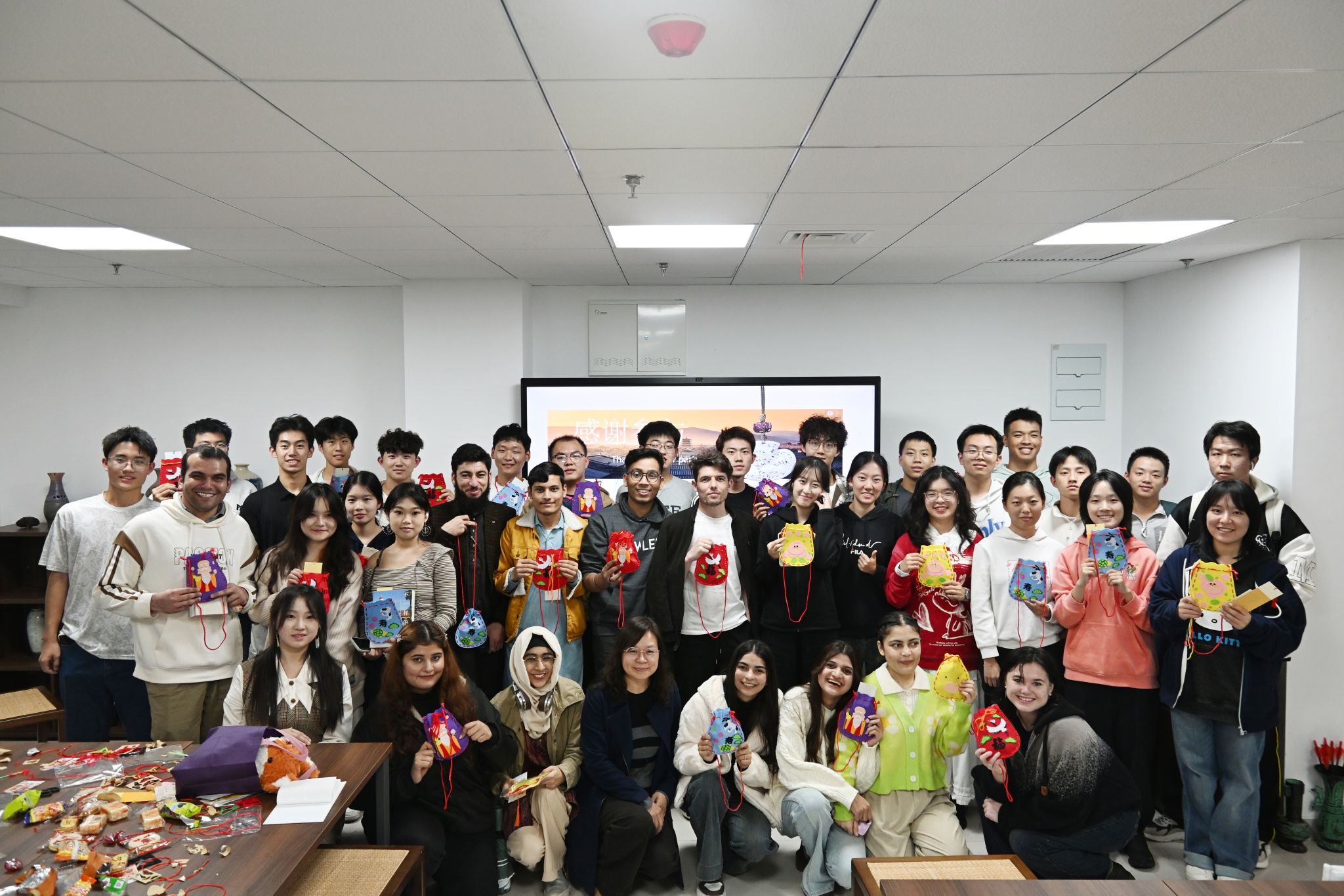 现场为大家准备了一系列材料以供大家亲手制作一个香囊,同学们纷纷挑选心仪的样式便开始了创作,在中外员工的相互合作下,一个个承载着祈福寓意的香囊制作完成。大家将它举在胸前,伴随着职工的一声happy,机器人2501宋俊锐用相机咔嚓一声定格下这一美好画面。